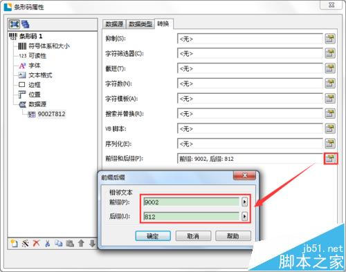 4、切換至“轉換”選項卡,點擊“前綴和后綴”后面的按鈕,輸入前綴9002,后綴812,點擊確定,點擊關閉。已完成BarTender數據之間的關聯,可以修改文本數據,查看設置是否無誤。