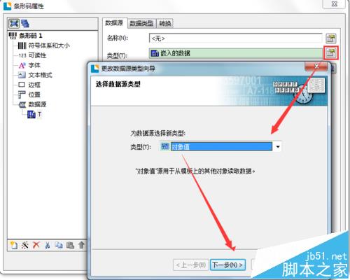 2、雙擊條碼,將數據源類型修改為“對象值”。單擊下一步。
