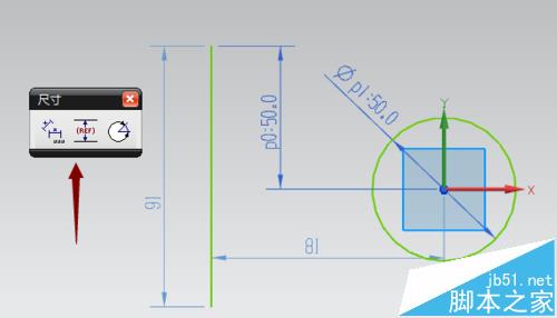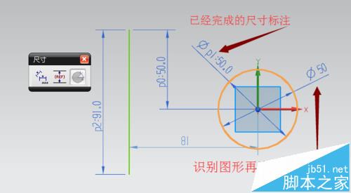 4、對于已經(jīng)編輯過的尺寸,只能點擊尺寸進行修改不能進行圖形識別改尺寸,因為已經(jīng)進行約束。如圓的直徑50,已經(jīng)完成尺寸編輯,使用圖形識別再次進行尺寸編輯,識別之后點擊左鍵確定,彈出尺寸已經(jīng)約束對話框