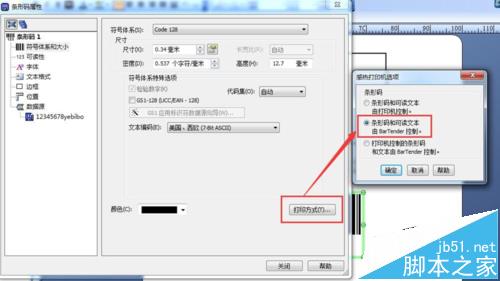 1、雙擊模板中的條形碼對象,在條碼屬性對話框中選擇符號與體系選項卡,單擊其右下方的“打印方式”按鈕,在彈出的“打印選項”中選擇“條形碼和可讀文本有Bartender控制”。單擊確定,單擊關閉即可。