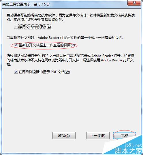 6、勾選重新打開文檔至上一次查看的頁面,單擊完成,設置結束