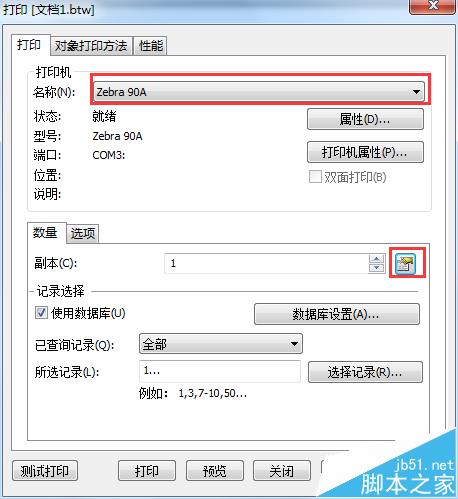 2、打開對應的標簽文檔,單擊菜單欄中的打印按鈕,在彈出的“打印”對話框中,選擇對應的打印機,單擊打印選項卡數量欄中副本右側的按鈕。