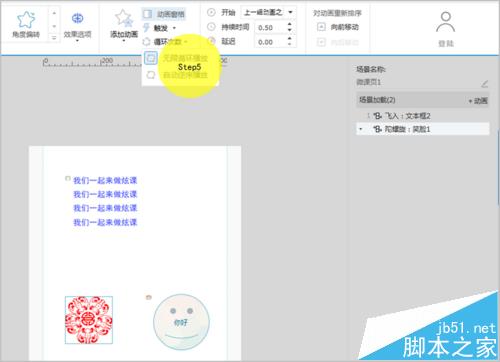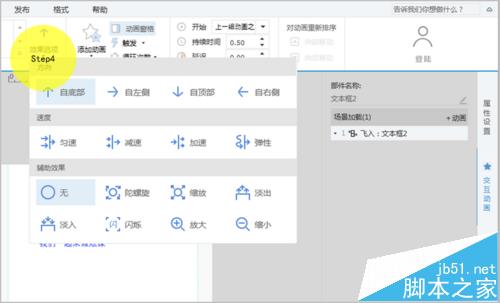 4、動畫添加完后,我們可以通過動畫--效果選項,為添加的動畫選擇進入場景的方向、速度及一些輔助效果
