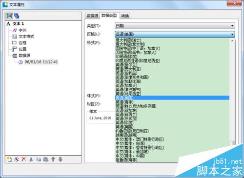 2、在“數據類型”選項卡中,單擊“區域”下拉表,選擇對應區域,在“格式”列表中,將自動對應該區域的日期格式。本文選擇英語(美國),設置英文縮寫格式。