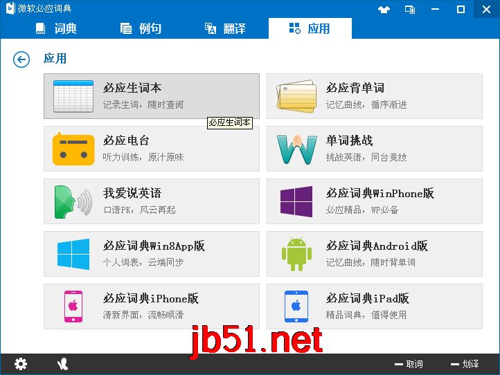 點(diǎn)“應(yīng)用”,我們可以看到必應(yīng)詞典的許多版本,讓必應(yīng)詞典時時刻刻都不離開你
