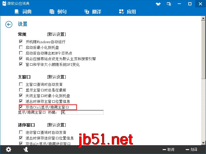 必應(yīng)詞典顯示和隱藏主窗口的快捷鍵是雙擊Ctrl,也可以在必應(yīng)詞典的設(shè)置里面的常規(guī)設(shè)置中,設(shè)置自己習(xí)慣的顯示和隱藏主窗口的快捷鍵