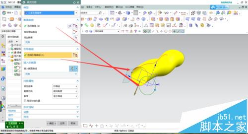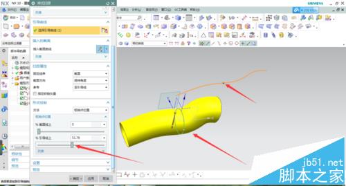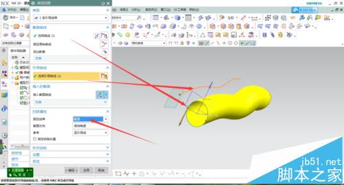 4、將固定線串調整為截面,則掃掠特征移動到截面圓曲線對齊。打開形狀控制下拉框,移動截面線和引導線樞軸點位置,可以改變掃掠特征的位置和形狀。如圖所示