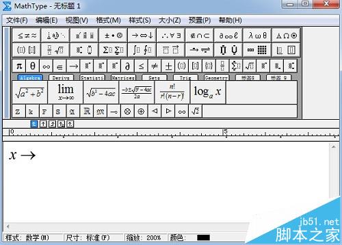 1、打開MathType公式編輯器,進入到公式編輯窗口進行相應的編輯,比如x趨近于無窮。打開MathType公式編輯器的方式可以按照自己的習慣來,對編輯公式的過程及結果沒有影響。