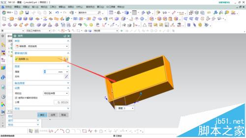 2、選擇插入/偏置縮放/抽殼,選擇移出面抽殼,選擇頂平面為要抽殼的面,生成一個盒子的形狀,如圖所示。