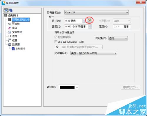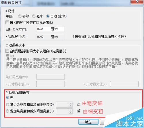2、雙擊條形碼,彈出的“條碼屬性”對話框中,在“符號體系和大小”屬性選型卡中,點擊“尺寸”選擇框后的按鈕,在彈出的“條形碼X尺寸”對話框的下方,“手動條/間距調整”選擇區(qū),即可以根據您的需要對BarTender 2016條碼線的粗細進行設置。