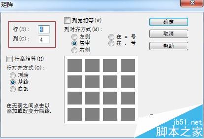 2、在彈出的對話框中,在“行”和“列”的輸入框中輸入4,即建議一個4行4列的矩陣,其它進行默認,點擊“確定”按鈕“就可以了。