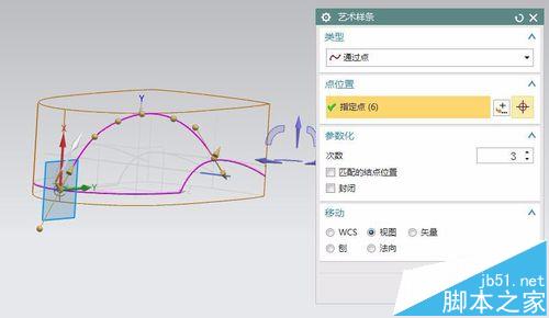 6、繪制藝術(shù)樣條。 單擊【曲線】|【藝術(shù)樣條】命令,在工作區(qū)中連接兩投影曲線與YZ平面的兩交點,在兩點間創(chuàng)建階次為3的藝術(shù)樣條曲線,結(jié)果如下圖所示。