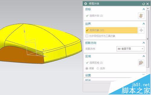 12、修剪片體。 單擊【插入】|【修建】|【修建的片體】命令,在工作區(qū)中選擇鼠標兩側(cè)面為目標,選擇前端面為邊界,結(jié)果如下圖所示。