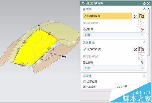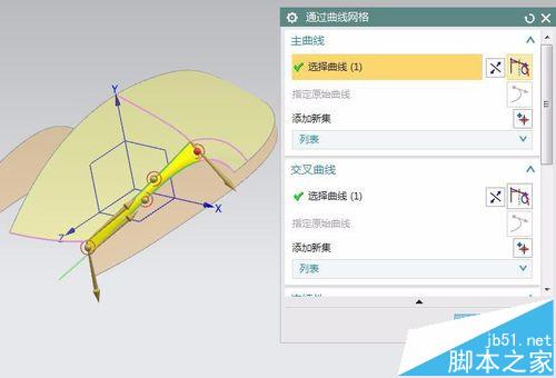 8、創(chuàng)建網(wǎng)格曲面2。 單擊【曲面】|【通過曲線網(wǎng)格】命令,在工作區(qū)中依次選擇投影曲線1和橋接曲線1為主曲線,選擇兩條相切面邊緣線和橋接曲線2為交叉曲線,結(jié)果如下圖所示。