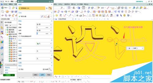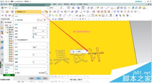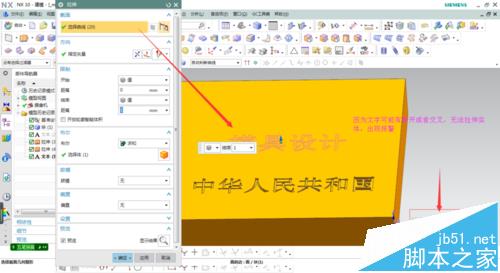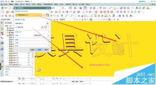 5、這些文字線條無法修剪,第一種解決辦法點擊插入/派生曲線/投影,選取線條投影到平面上時行修剪,如圖。第二種解決辦法點擊插入/派生曲線/抽取,選擇封閉的線條抽取出來。再次進行拉伸成功,效果如圖