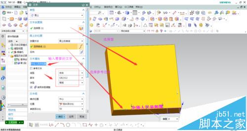 1、隨意繪制一個長方體,點擊插入/曲線/文本,生成文本對話框,選擇在面上生成文字,選取一條邊線作為參考邊,具體操作如圖所示。