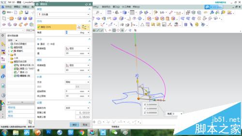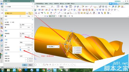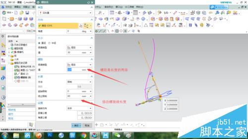 5、于是把定位方向改成矢量方向,選擇縱向軸或者先前畫的那條直線,結果如圖。看起來樣子對了,但有點短,返回修改螺旋線螺距和長度,最后效果如圖