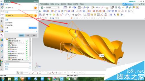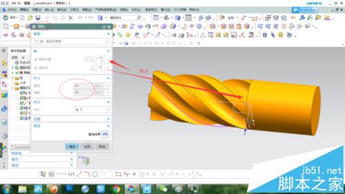 6、再用拉伸命令拉伸刀柄,如圖所示。隱藏掉草圖、曲線和坐標。刀槽處收尾有個螺旋升角,提取連線畫如圖的線條作掃描線,再畫一條螺旋線做引導線