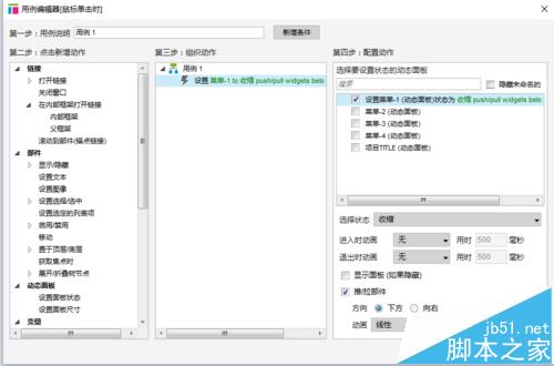 5、當(dāng)從展開(kāi)收縮狀態(tài)點(diǎn)擊成收縮狀態(tài)時(shí),設(shè)置鼠標(biāo)點(diǎn)擊用例,面板狀態(tài)選擇到“收縮”,并勾選推拉部件,方向選擇下方。