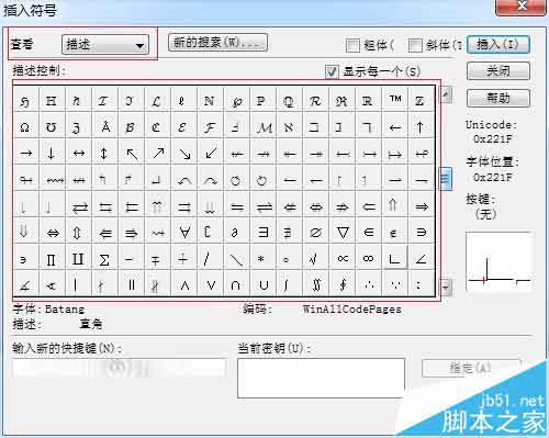 3、在彈出的“插入符號”對話框中,將“查看”設(shè)置為“描述”,在“查看”的下方會自動出現(xiàn)很多符號模板。
