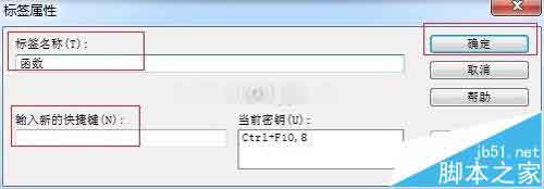 4、點擊“屬性”后會彈出“標簽屬性”的對話框,在“標簽名稱”這一欄中輸入你所需的標簽名稱比如“函數”,在快捷鍵中也可以輸入你想要的快捷鍵組合,然后點擊“確定”。