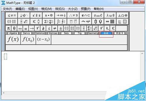 2、將MathType公式編輯器打開后,會看到MathType模板下面有一行分類的標簽。如果MathType標簽欄消失了,可以點擊“視圖”——“標簽欄”。