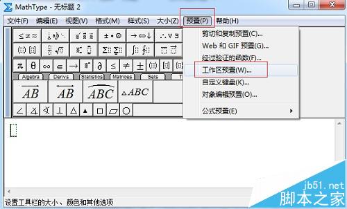 2、在MathType菜單欄中,選擇“預置”——“工作區預置”。