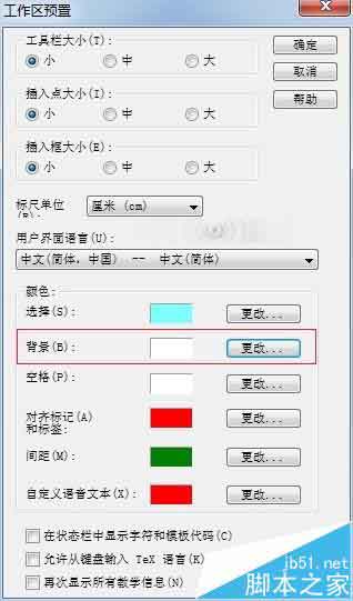 3、進入工作區預置后,會彈出一個“工作區預置”的對話框,在這個對話框的下部,有一個“顏色”功能,我們看到在“背景”這一欄中,顏色是白色,點擊“背景”后面的“更改”按鈕。