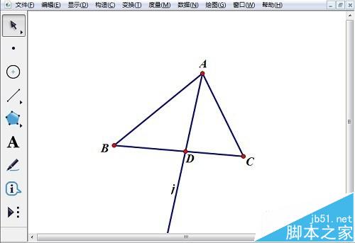 3、單擊“移動箭頭工具”,依次選中點B、點A和點C。執行“構造”—“平角分線”命令,構造出∠BAC的角平分線j。單擊“移動箭頭工具”,單擊射線j和線段BC的交點處(狀態欄提示:單擊構造交點),構造出射線j和線段BC的交點D。