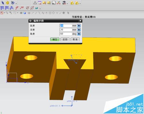 6、創(chuàng)建燕尾槽插入 –設(shè)計(jì)特征—鍵槽,選擇燕尾槽,點(diǎn)擊貫通。之后選擇實(shí)體面實(shí)體面的長邊,選擇貫通的起止兩個(gè)面,之后確定了鍵槽的位置,定位選擇垂直,之后選擇一開始選擇的實(shí)體面的邊,距離為35mm,完成創(chuàng)建槽
