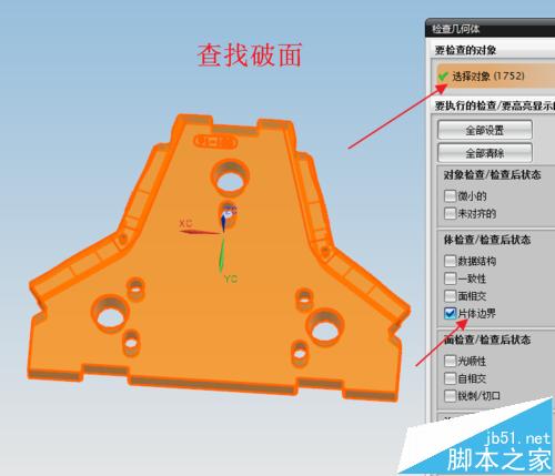 2、通過分析菜單,檢測檢測幾何體,找到有產品的破口,如圖所示: