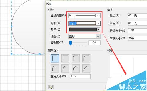 3、鼠標右鍵單擊圓形,選擇“格式”-“線條”選項,在彈出對話框中編輯圓形的邊緣線條,如圖所示。