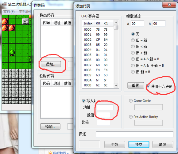 損失一個人數。進入添加代碼窗口,在“搜索過濾器”中的a中輸入3,b中輸入2。選中r0=a和r1=b。在cpu內存窗口中就會只剩一個地址,它就是1p的人數。選中這個地址,就會出現在“原始數據”的地址中,在“值”中輸入5。點“提交”,這個地址就被添加到金手指代碼中。