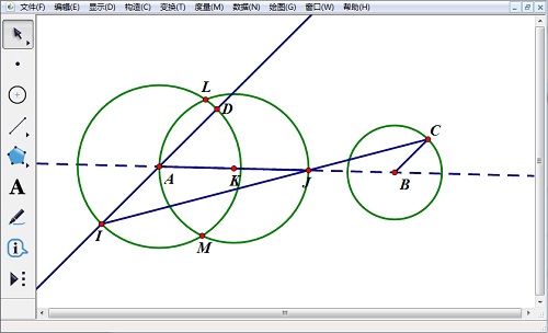 6、分別構造出直線JL和直線JM,即為所求的內公切線。隱藏掉多余的圓、點、線等即可。(怎樣在幾何畫板中畫數軸?幾何畫板中畫數軸教程 )