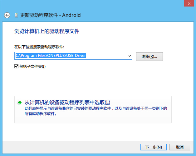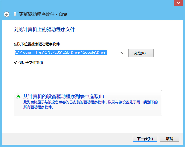 瀏覽,將其定位在"C:/Program Files/ONEPLUS/USB Driver/"目錄,下一步,即可完成第一部分的驅(qū)動(dòng).