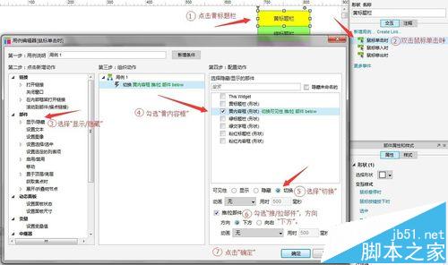 點(diǎn)擊黃標(biāo)題欄——雙擊右側(cè)“鼠標(biāo)點(diǎn)擊時(shí)”添加用例——選擇左側(cè)“顯示/隱藏”部件——右側(cè)配置動(dòng)作中,勾選黃標(biāo)題欄——可見性中選擇“切換”——勾選“推/拉部件”,方向選擇“下方”,點(diǎn)擊確定(亦可跟隨圖示按步驟進(jìn)行)。