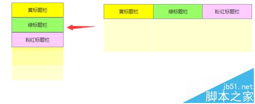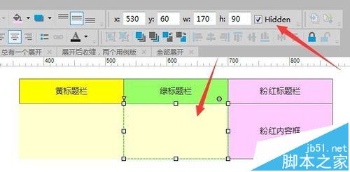 將下面的三個(gè)內(nèi)容框矩形設(shè)為隱藏:選中要隱藏的部件,點(diǎn)擊勾選“hidden”;接著,把綠色部分移到黃色標(biāo)題欄下面,遮住綠色隱藏部分,粉紅色類推,變成圖中的左側(cè)堆疊形態(tài)。