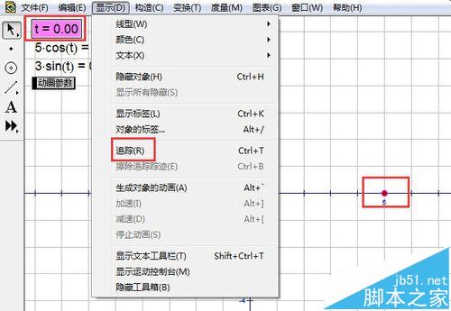 5、單擊選中動點,單擊顯示---追蹤點。雙擊t,把它的值改為0,目的是讓動點歸位。