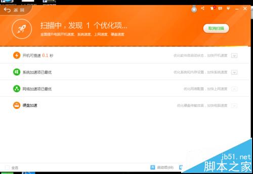 3、單擊右上角的開始掃描,出現(xiàn)正在掃描界面,等待掃描完成,如圖所示,由于本人電腦經(jīng)常清理,所以沒有什么建議優(yōu)化的啟動項,有的則不然,點擊右下角的啟動項,出現(xiàn)如圖所示的界面,