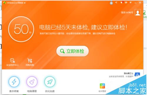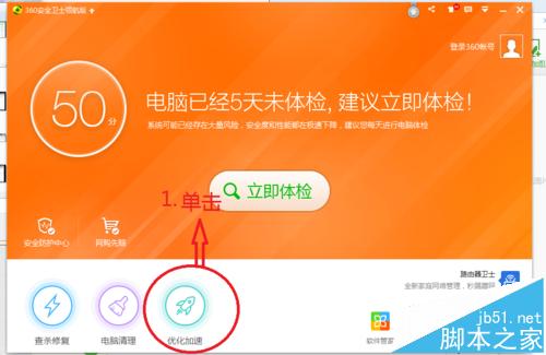 2、我們先要檢查一下是否被360安全衛(wèi)士禁止開機啟動了,打開360,點擊左下角的優(yōu)化加速(360版本不同這個功能可能不在這個地方),出現(xiàn)如下圖所示的界面