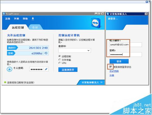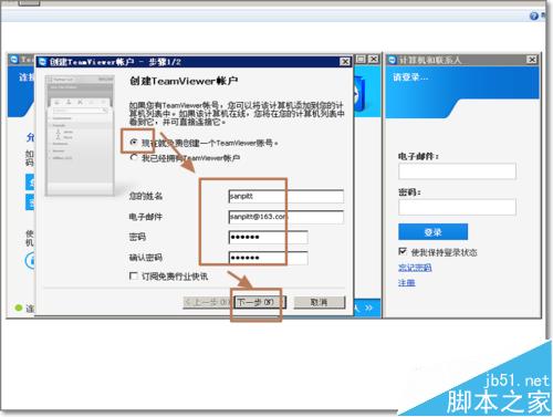 3、填寫:電子郵件-密碼-下一步-完成,為什么要注冊一個TeamViewer帳戶呢?因為我們可以將我們的經常控制電腦加入到我的伙伴中。在另一端也使用自己的賬戶登陸后在我的伙伴中可以看到加入的電腦。直接點擊,不用輸入密碼就可以遠程控制。