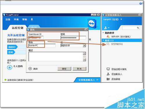 7、登陸后,可以看到本機的電腦名字,點擊增加遠程計算機,可以將另外一臺需要遠程控制的電腦加入到我的伙伴中,如圖,若遠程計算未開機或未聯網,在我的伙伴中看到計算機是離線狀態的。同時也可增加其它注冊過TeamViewer帳戶的成員,相當于好友。相互之間可以快速連接,比如遠程視頻會議。