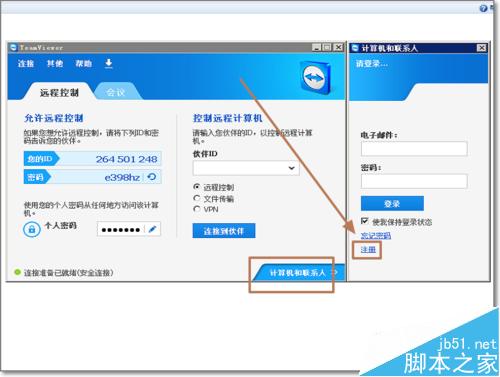 2、右則滑出計算機和聯系人賬戶登陸界面,在沒有注冊TeamViewer賬號前,點擊注冊,進行新用戶注冊。