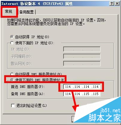 5.在屬性面板中,切換到常規選項下,勾選【使用下面的DNS服務器地址】,輸入你在上面得到的DNS地址,然后點擊確定按鈕,設置完成。