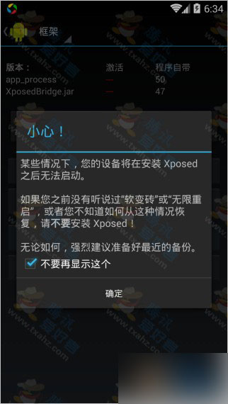 4、最后“確定”這里會卡住,我們強制關閉再打開模擬器便可。再次打開模擬器的時候,框架這里的紅色提示就沒有了,說明已經安裝成功了。然后我們再點擊“模塊”。如下圖: