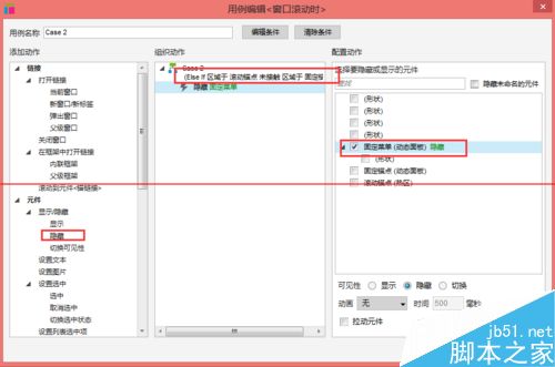 繼續在“窗口滾動時”事件上添加動作,添加條件“元件范圍 滾動錨點 未接觸 元件范圍 固定錨點”,確定,設置動作為“隱藏 固定菜單”。
