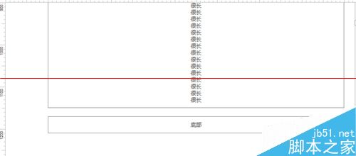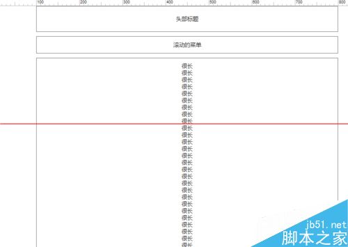 為了體現效果,我們需要做一個比較長(高)的頁面,在Axure工作區中拖入4個矩形,分別為頂部標題、菜單、頁面內容、底部。設置矩形寬度和高度,讓其看起來像是一個頁面布局。