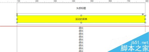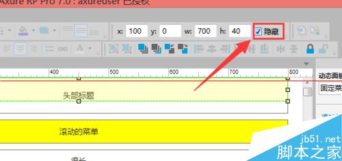 滾動中固定在頂部的標題并非頁面上的標題,是單獨制作的。復制“標題1”,將復制的標題命名為“標題2”,設置“標題2”x坐標等于“標題1”的x坐標,y坐標等于0。修改“標題2”背景色為藍色。