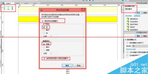 在工作區中拖入一個動態面板,設置其x和y坐標等于0,調整其寬度和高度分別為60和20,將動態面板命名為“固定錨點”,設置其固定到瀏覽器。