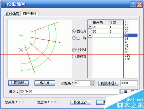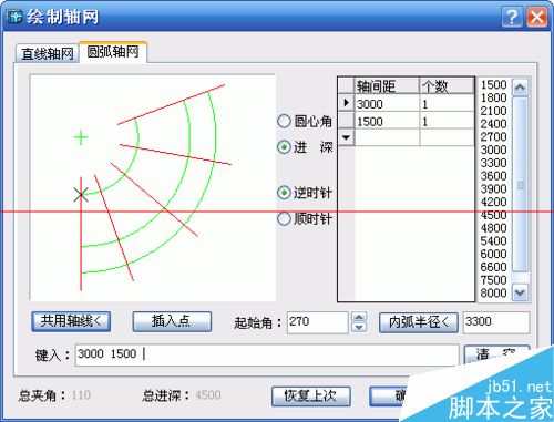 單擊繪制軸網菜單命令后,顯示【繪制軸網】對話框,在其中單擊“圓弧軸網”標簽,輸入進深的對話框如下: